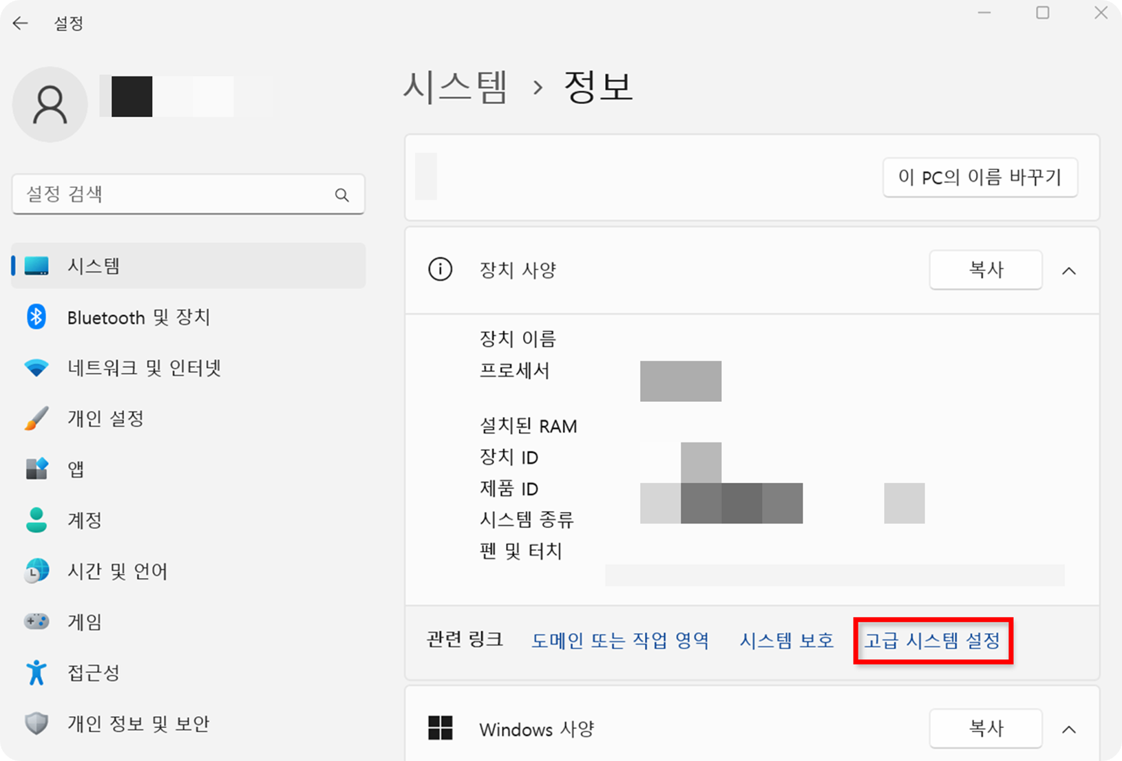 2.1.2. 시스템 정보 [고급 시스템 설정]을 클릭합니다.