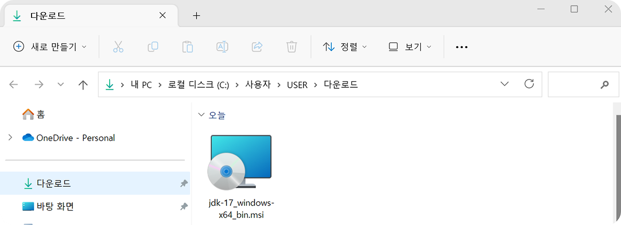 파일 탐색기에서 다운로드 받은 jdk-17_windows-x64_bin.msi 설치파일을 더블클릭하여 실행해 주세요.