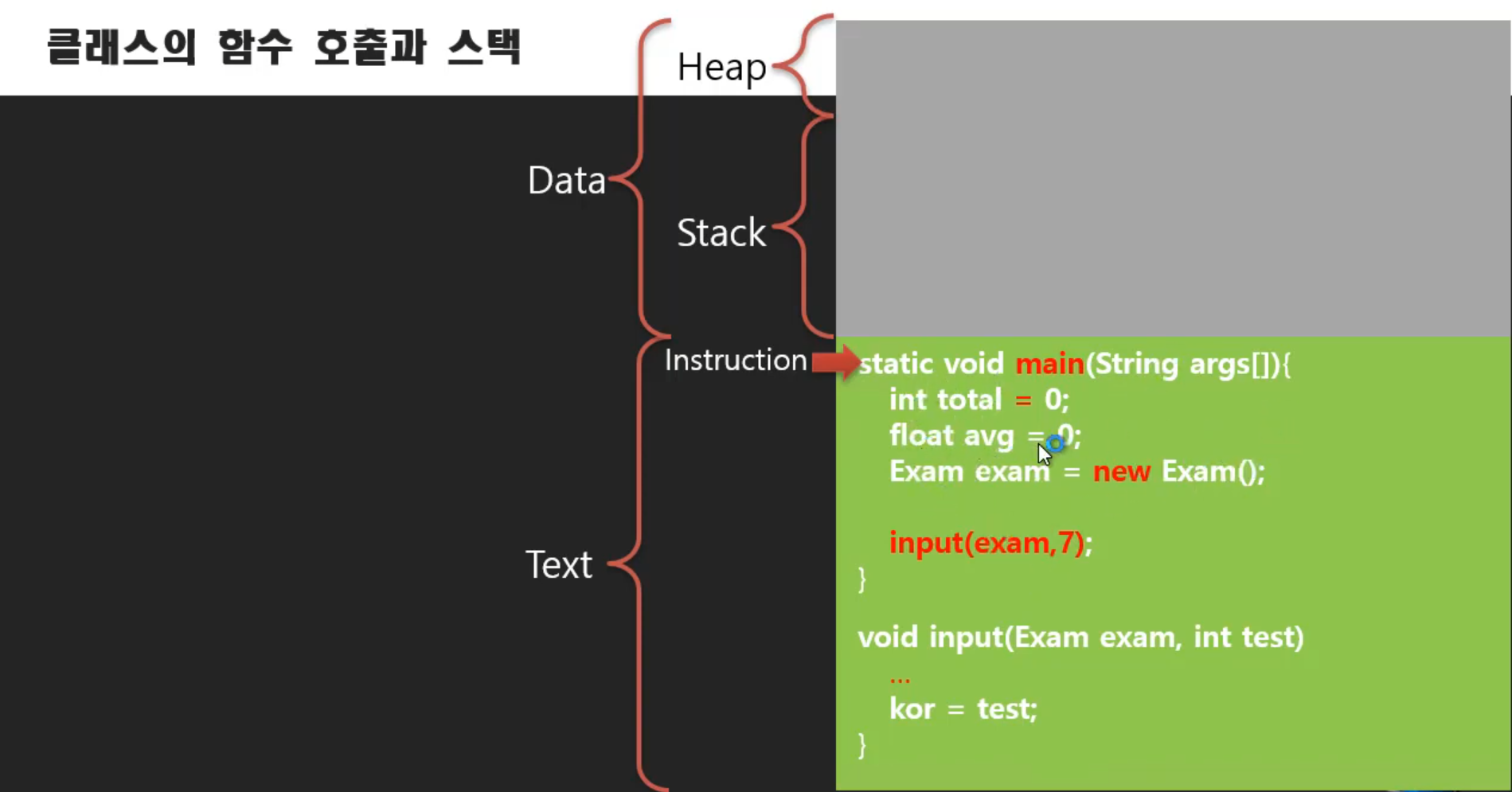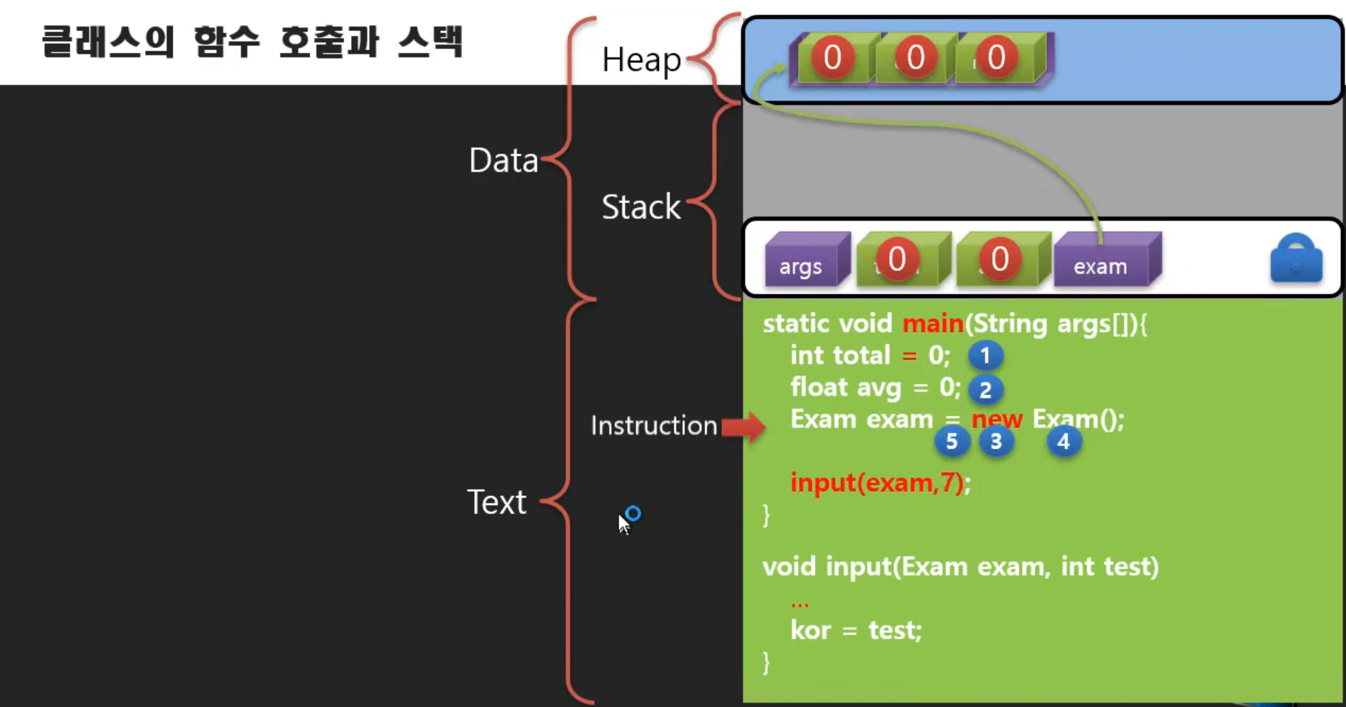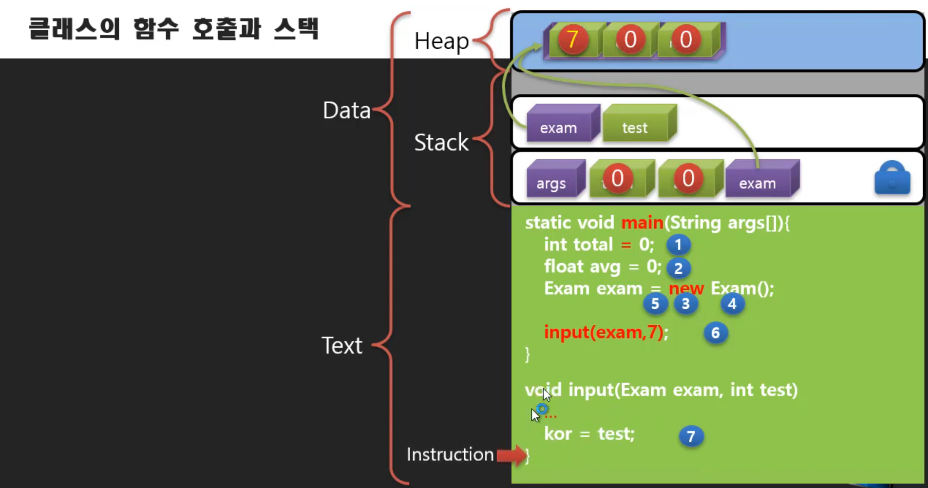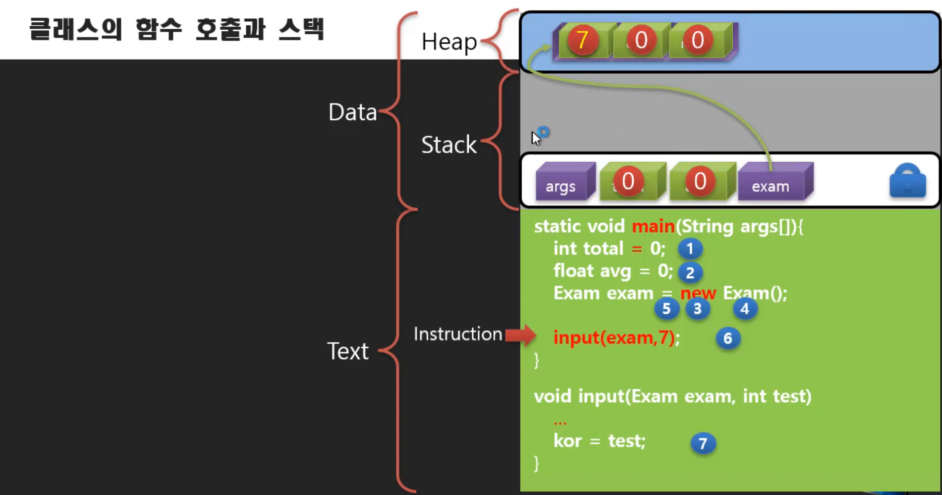공간이 생성되고 난뒤, 매개변수(exam,7)을 값을 넣으면 input메서드 매개변수 exam 또한 Heap 영역의 주소값을